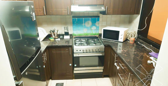 The living and dining area is bright and inviting, featuring a sofa set, armchair, coffee table, TV unit, and a dining table with chairs. A sliding window open onto a balcony, allowing plenty of natural light and offering an outdoor extension of the living space. The separate kitchen is fully equipped with ample cabinetry, a gas stove with oven, refrigerator, microwave, and sufficient counter space, making it suitable for everyday cooking and storage.